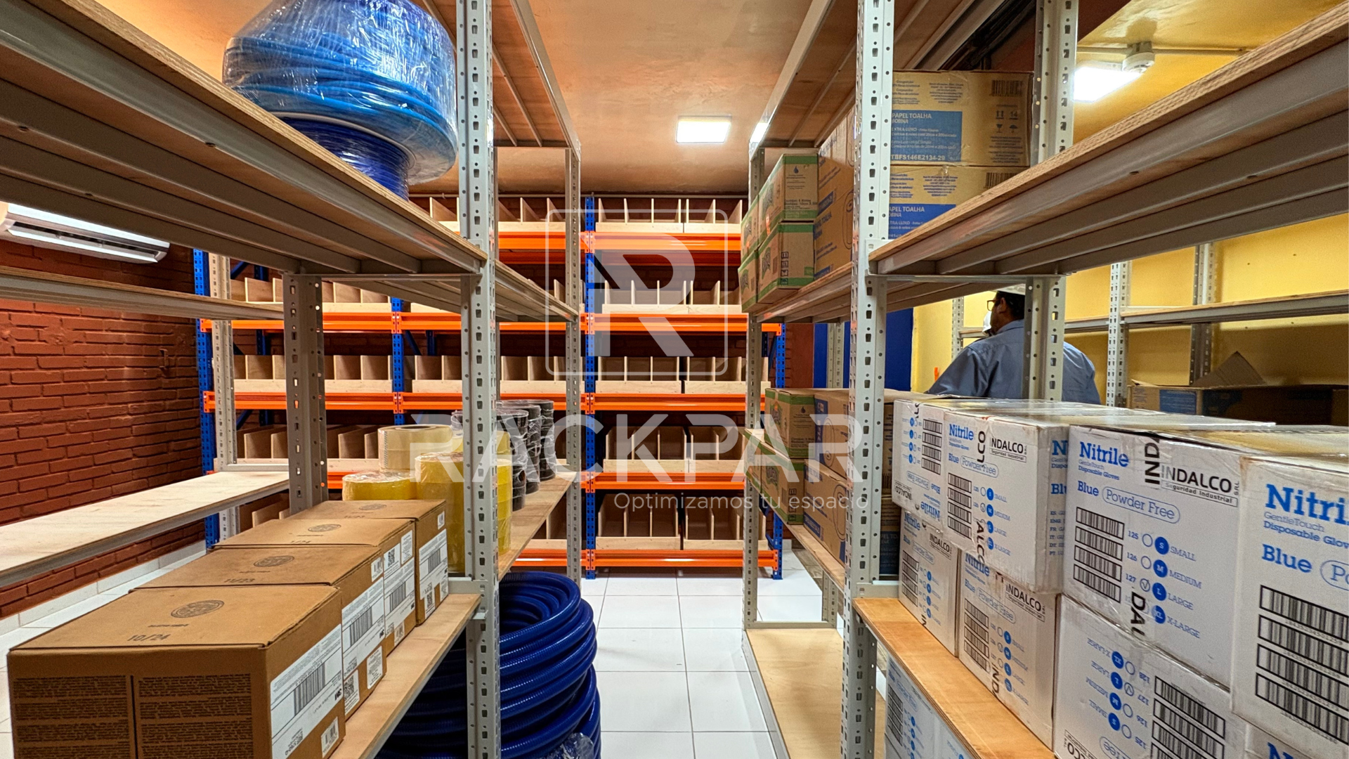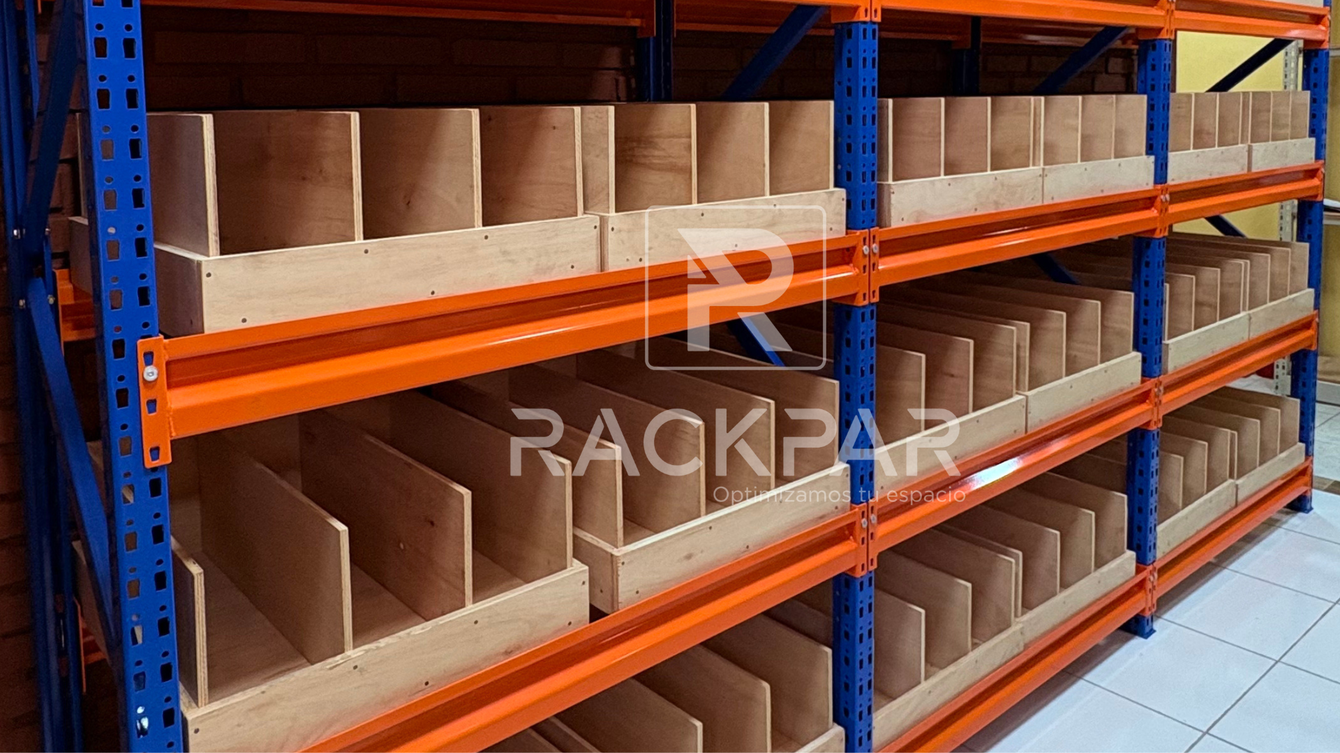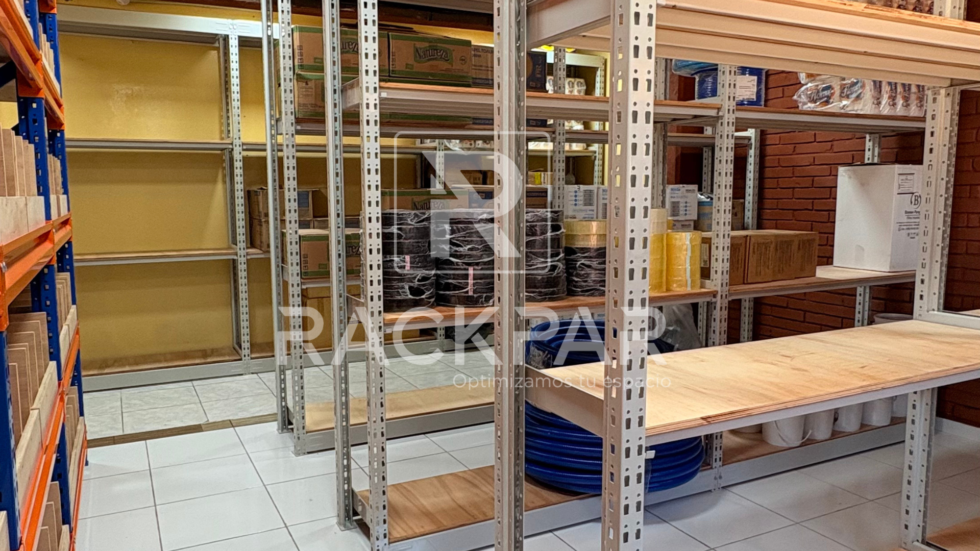 Se instalaron 9 módulos de Rack Mediano (4 niveles, bandejas multilaminadas, 150 kg por nivel) y 3 módulos Viga Z con cajas y divisorias.